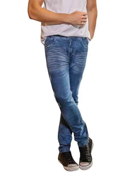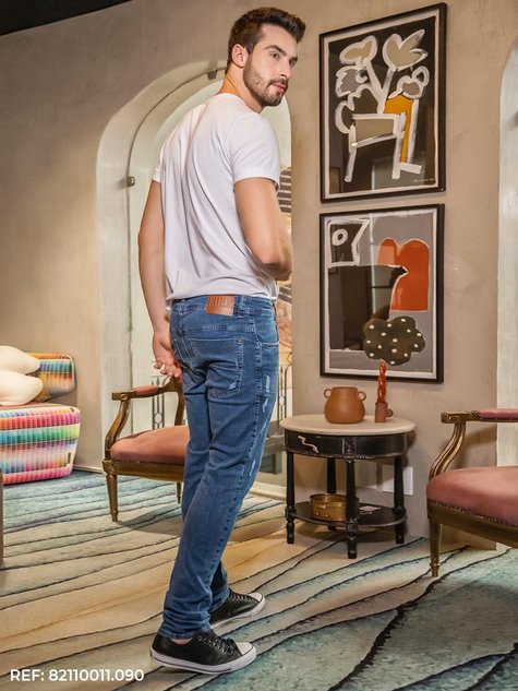 Modelagem com cós fino e pernas levemente justas e confortáveis, etiqueta personalizada Edex Jeans na parte posterior. Peças nas cores azul/ azul claro, detalhes em destroyed, e aviamentos na cor bronze, dando alta performance ao produto.