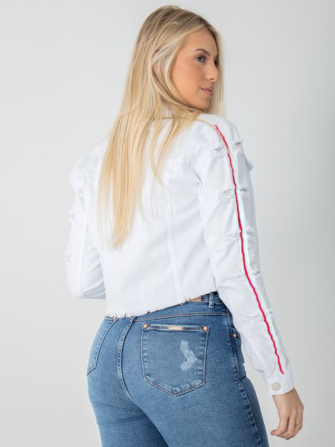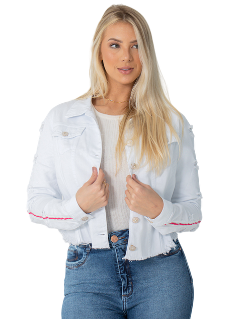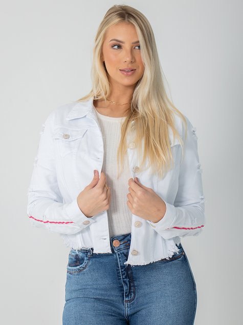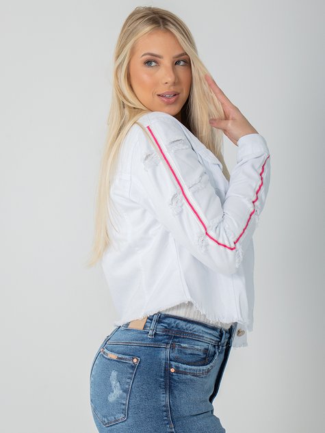 Peça na cor branco, modelo cropped com barra desfiada. Possui dois bolsos frontais, abertura no punho com fechamento de botăo, conta com detalhes em destroyed e listras na manga, na cor rosa, e ainda conta com recortes na parte frontal e posterior, dando um toque de sofisticaçăo.